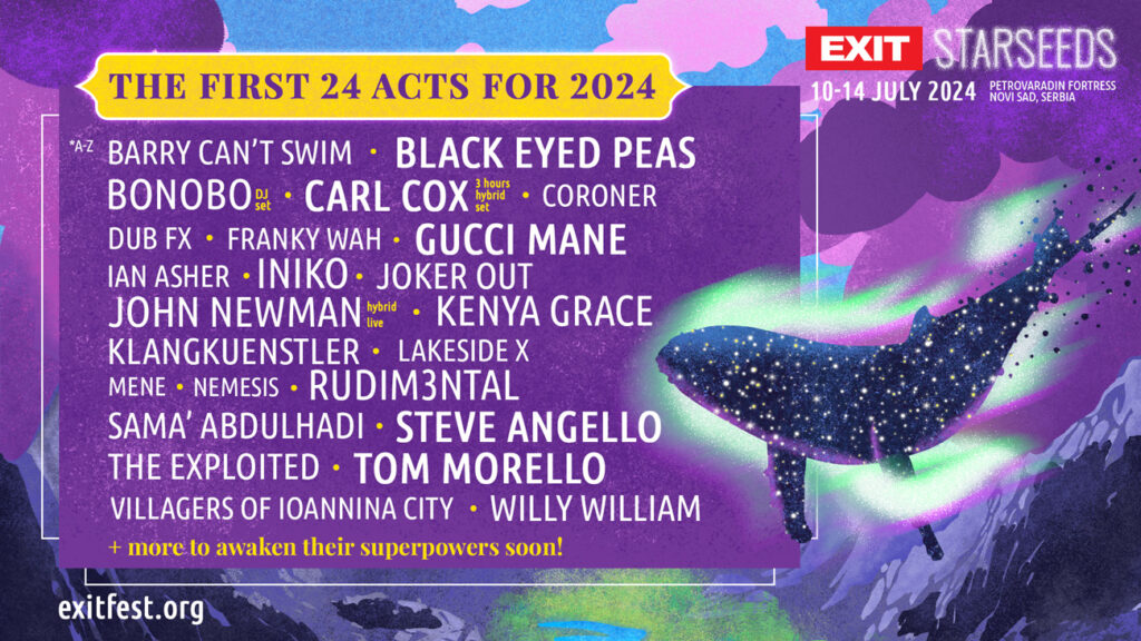 EXIT festival upravo je predstavio prva 24 imena za svoje naredno izdanje, EXIT Starseeds, koje predvode pop-rap ikone i jedan od najuspješnijih glazbenih sastava svih vremena Black Eyed Peas, jedan od najinovativnijih gitarista svijeta i pokretačka snaga benda Rage Against the Machine Tom Morello i utemeljivač globalnog trap zvuka Gucci Mane!